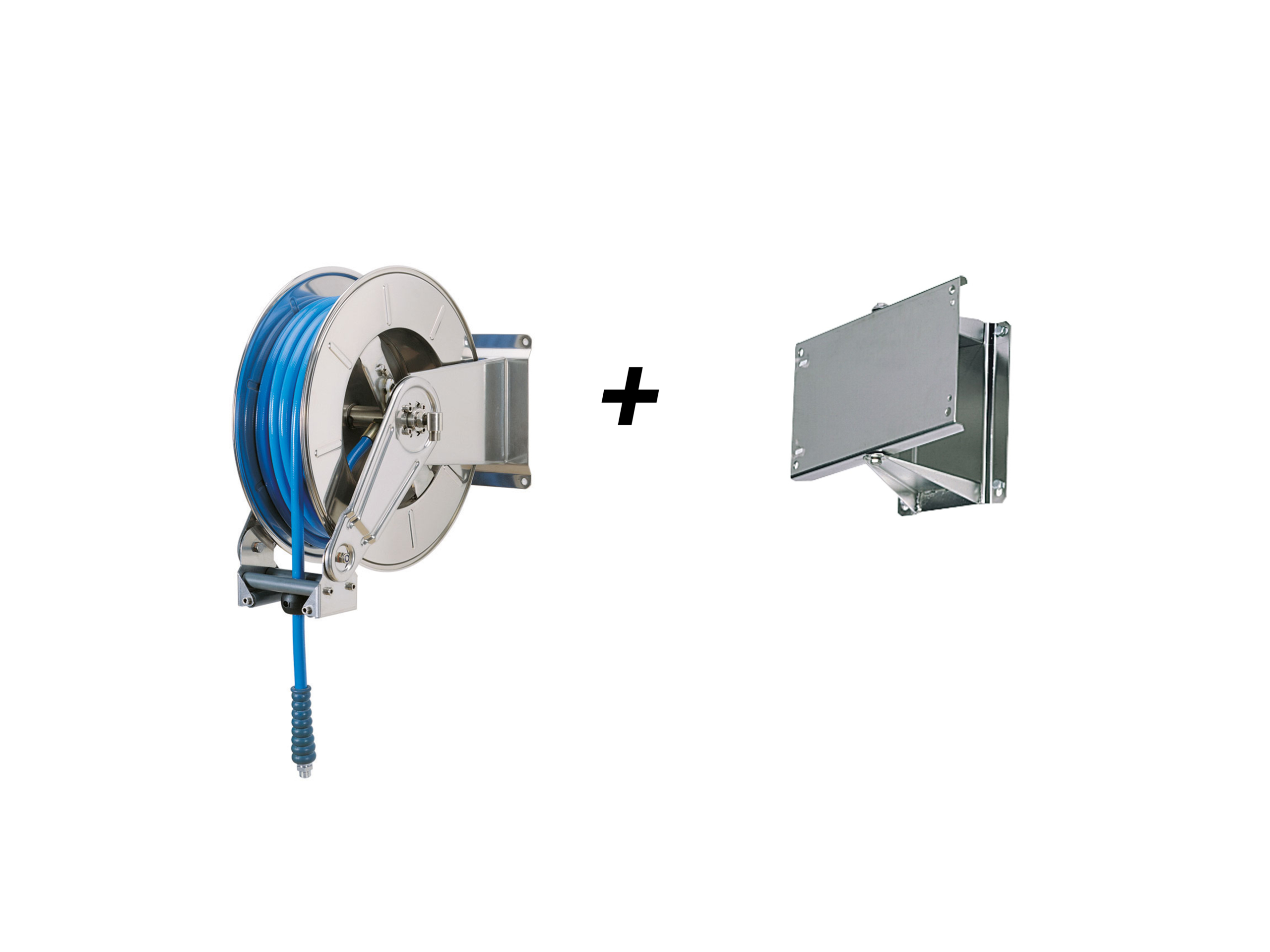 Geassembleerde slanghaspel met Foodwash slang (80bar/150°C), connectieslang en muurbeugel